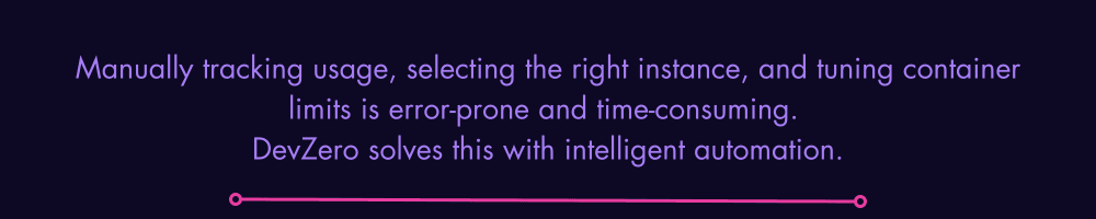 Manually tracking usage, selecting the right instance, and tuning container limits is error-prone and time-consuming. DevZero solves this with intelligent automation. DevZero's Kubernetes optimization platform eliminates wasteful over-provisioning by dynamically rightsizing containers in real-time, analyzing workload requirements and intelligently adjusting CPU and memory allocations without service disruption — delivering up to 80% infrastructure cost savings while maintaining application performance.