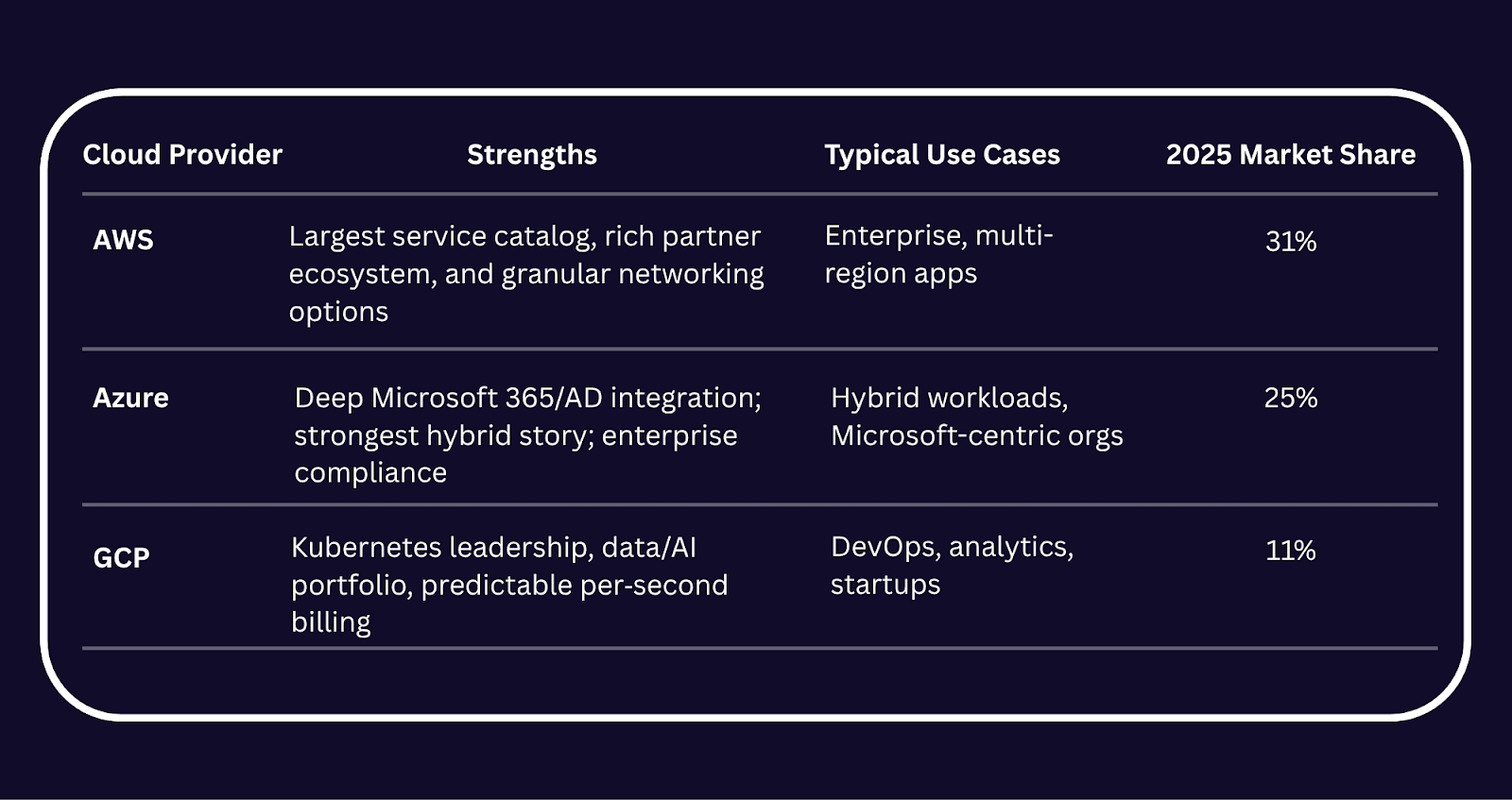 AWS is widely regarded as the most mature and comprehensive cloud platform. With the largest market share and the deepest set of services, AWS is often the go-to for large enterprises with diverse workload needs.