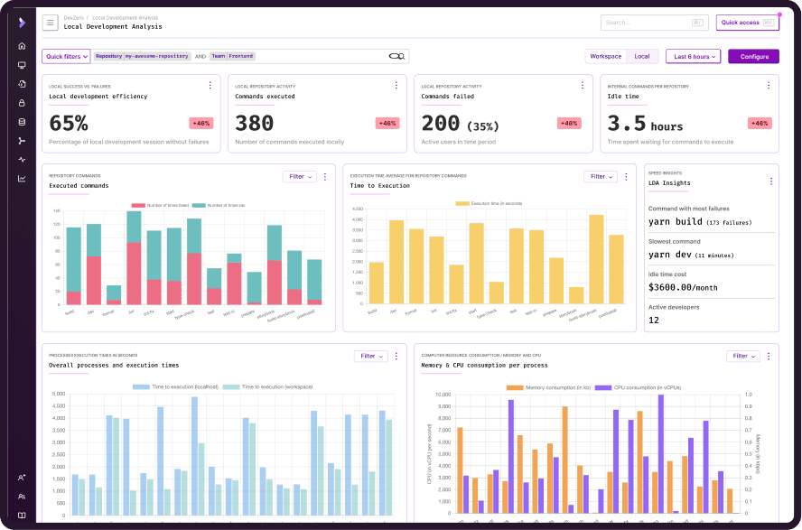 Here, you will learn how to identify resource-heavy commands that consume significant resources, enabling optimization for better performance and cost reduction. ODA monitors the following metrics: execution times, resource utilization, command success/failure rates, developer idle time, and processes spawned.