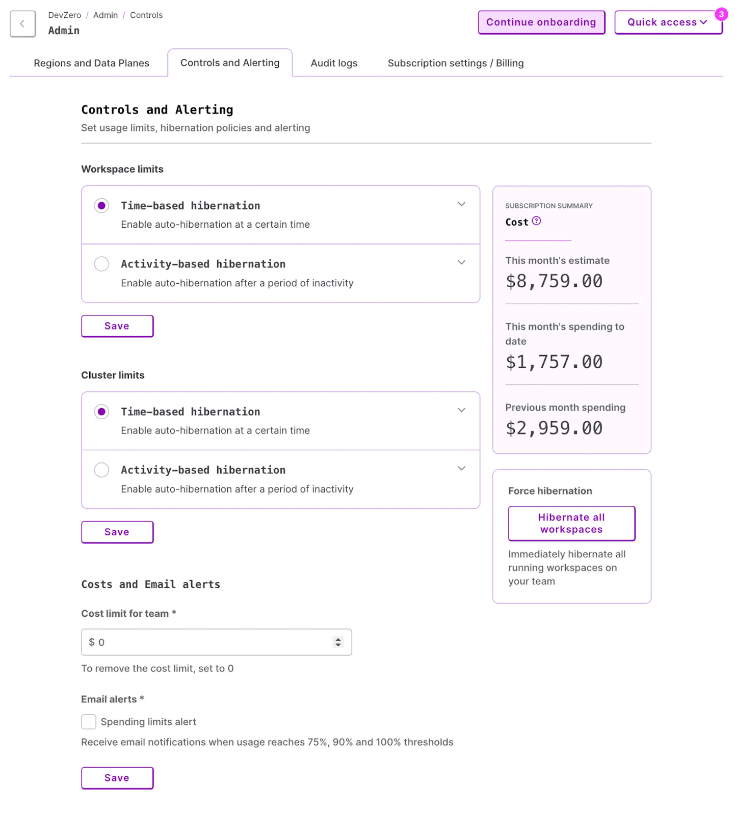 Here, you can learn about Time-based hibernation for automatically hibernating workspaces/clusters at a specified time, and Activity-based hibernation, which hibernates them after a defined period of inactivity. In addition, you can set email alerts on spending, and when resource usage reaches certain thresholds.
