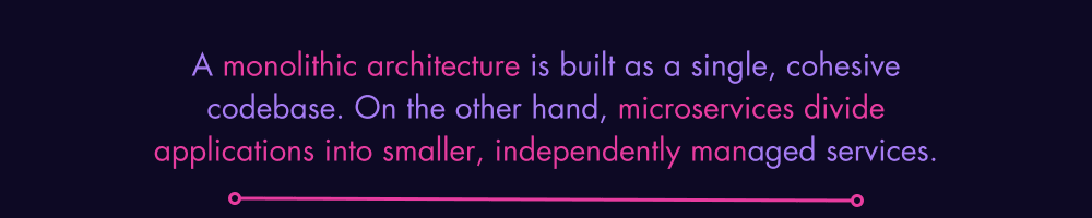 A monolithic architecture is built as a single, cohesive codebase. This simplicity can streamline the initial development process, as teams focus on one unified application. However, over time, managing a growing monolithic codebase becomes more complex. Small changes in one part of the system may require testing the entire application, which slows down development and increases the risk of bugs.